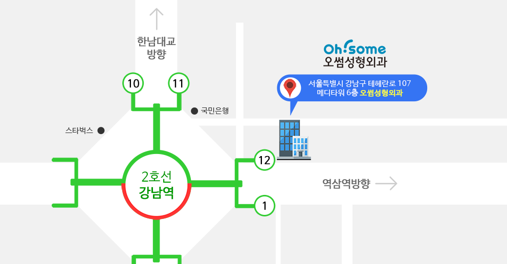 강남역 12번 출입구에서 도보로 약 30m 이내, 메디타워 6층에 위치해 있습니다.